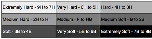 Here’s a chart with pencil grades and their general value ranges. (Each brand is different, so test your pencils to find their range.)